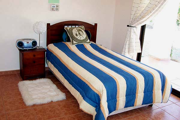 Each room has large closets, cheerful curtains and a ceiling fan. This first-floor bedroom features an oversize twin bed.