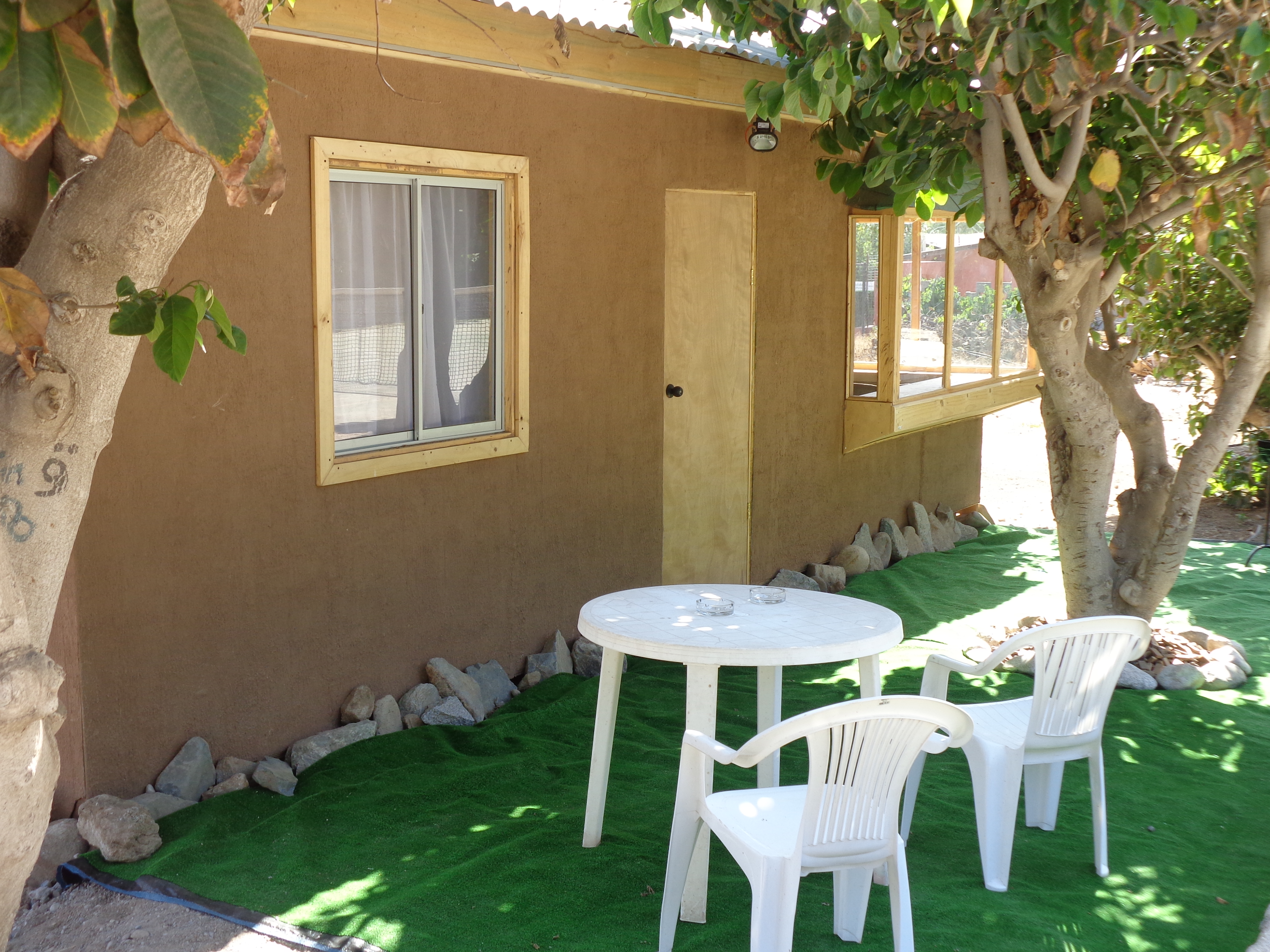 La sala de estar también da a un hermoso jardincito donde podrá descansar tras un reñido partido de tenis (pues queda al lado de la cancha) o simplemente disfrutar de una grata conversación junto a los suyos bajo la fresca sombra de los chirimoyos.