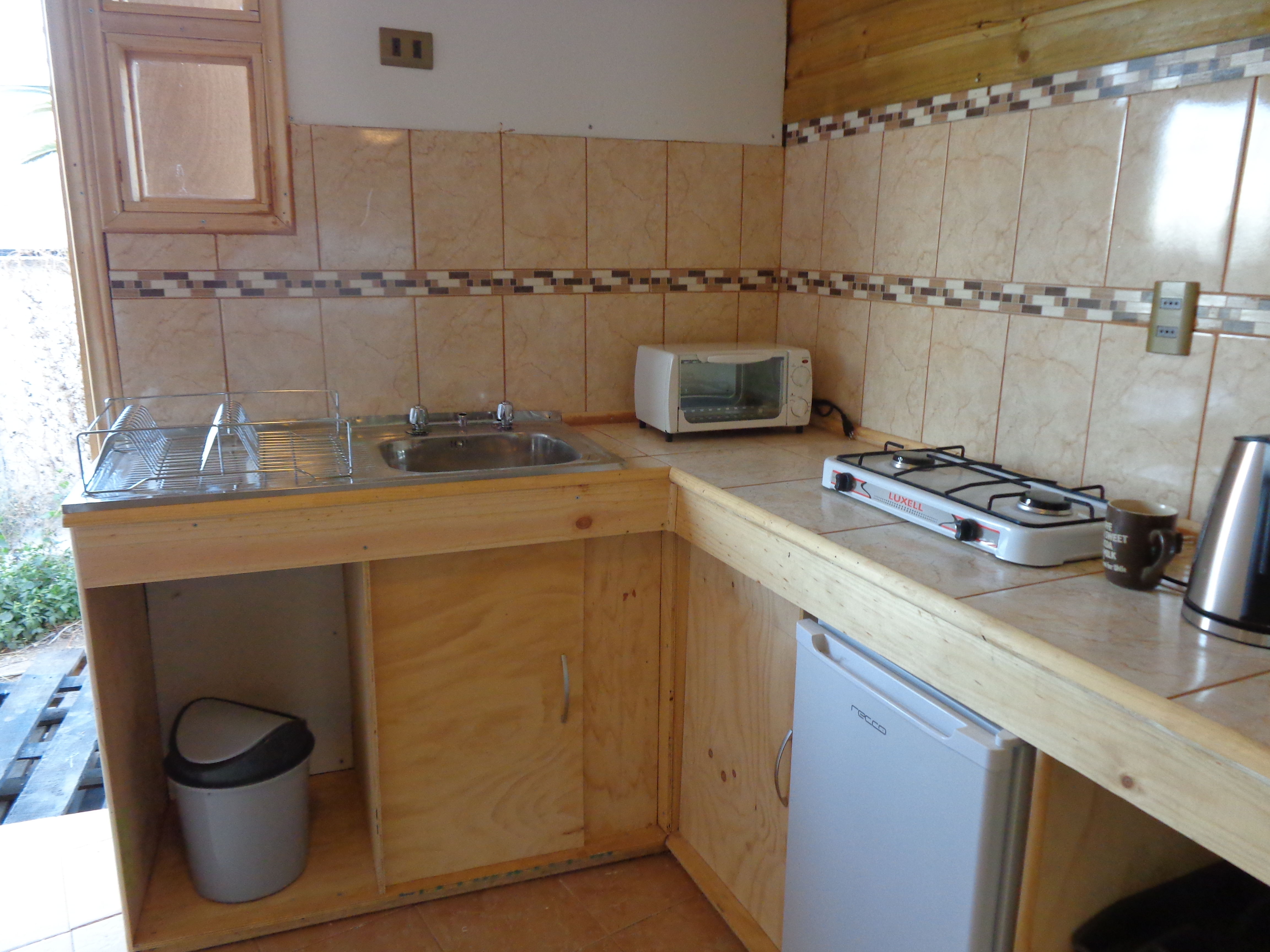 Esta linda y funcional cocina americana lo tiene todo: Refrigerador, cocina encimera, hornito eléctrico, hervidor, microondas, loza, utensilios y espacio por doquier; todo nuevo y flamante.
